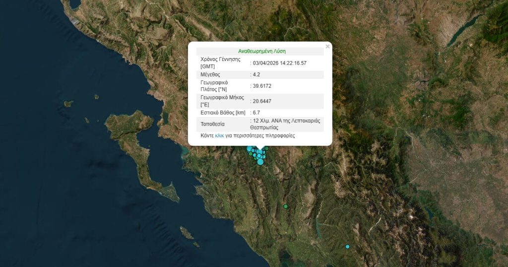 Ισχυρός σεισμός μεγέθους 4,2 Ρίχτερ σημειώθηκε το απόγευμα της Παρασκευής στη Θεσπρωτία.