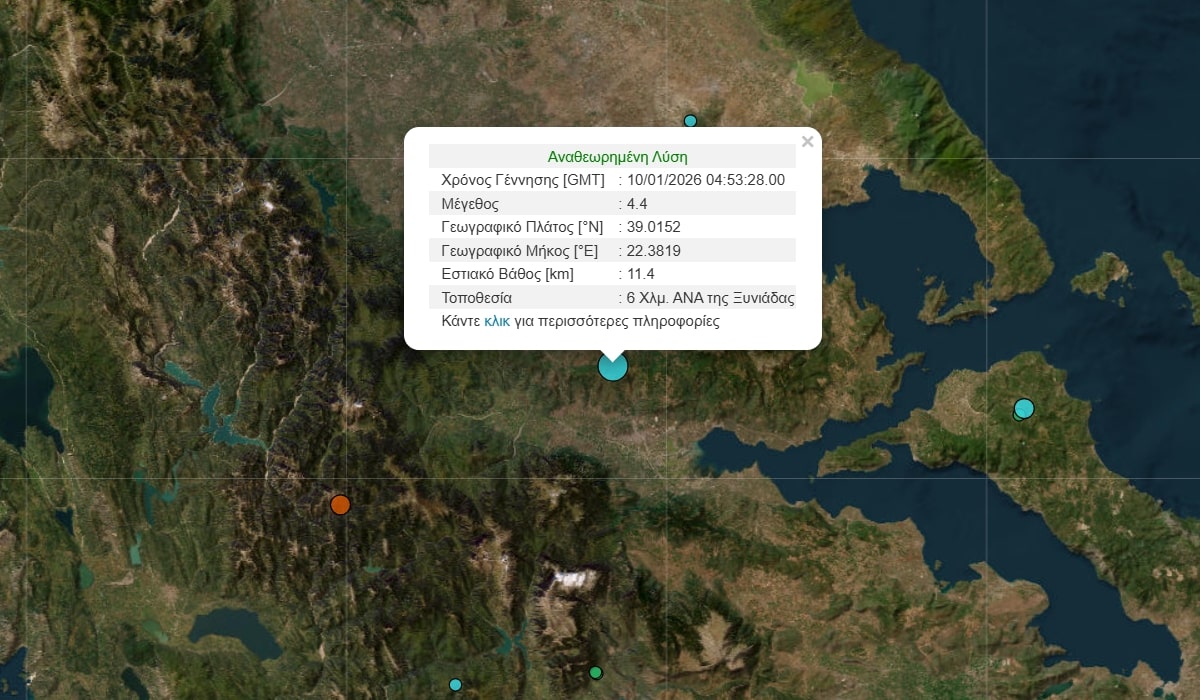 Σεισμός 4,4 Ρίχτερ με επίκεντρο στην Ξινιάδα Δομοκού, σημειώθηκε τα ξημερώματα του Σαββάτου.