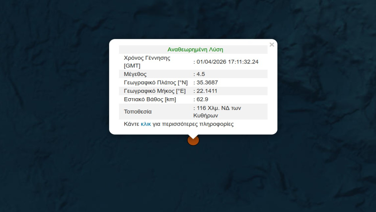 Ο σεισμός είχε εστιακό βάθος 62,9 χλμ. και έγινε σε περιοχή 116 Χλμ. ΝΔ των Κυθήρων.
