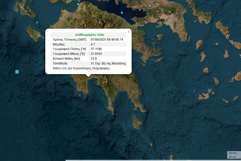 Σεισμική δόνηση μεγέθους 4,7 της κλίμακας Ρίχτερ σημειώθηκε σήμερα στις 12:49 στη Μεσσηνία.