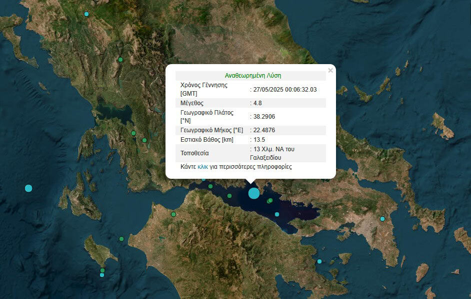 Σεισμός μεγέθους 4,8 βαθμών της κλίμακας Ρίχτερ σημειώθηκε έξι λεπτά μετά τις τρεις τα ξημερώματα στον Κορινθιακό κόλπο. Η δόνηση έγινε αισθητή και στην Αττική.