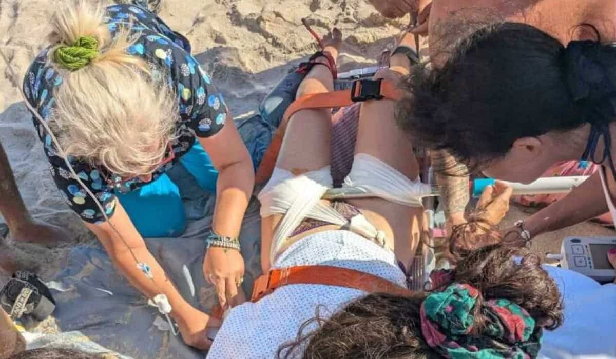 Στη συνέχεια με τη συνδρομή άλλων λουόμενων μετέφεραν την τραυματία με το scoop φορείο σε φουσκωτό σκάφος ιδιώτη, στο Π.Π.Ι. προκειμένου να μεταφερθεί με το ασθενοφόρο στο ελικοδρόμιο και από εκεί σε νοσοκομείο των Αθηνών.