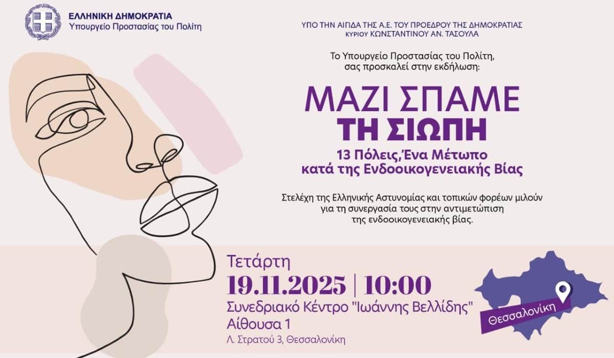 Το Υπουργείο Προστασίας του Πολίτη, στο πλαίσιο της δράσης «Μαζί σπάμε τη σιωπή. 13 Πόλεις: Ένα μέτωπο κατά της ενδοοικογενειακής βίας», διοργανώνει εκδήλωση στη Θεσσαλονίκη, την Τετάρτη 19 Νοεμβρίου 2025.