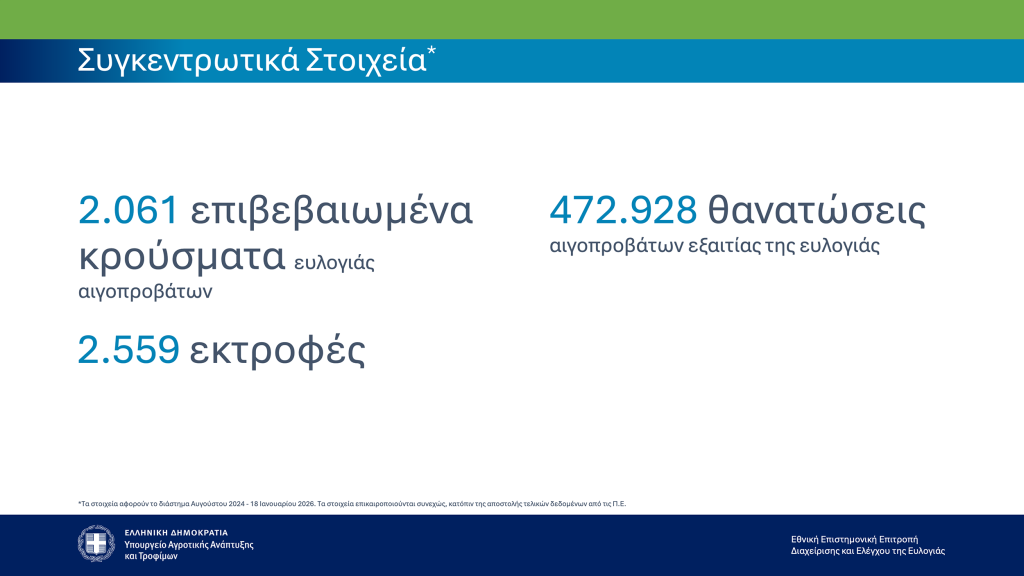 Σε 472.928 ανέρχονται τα αιγοπρόβατα που έχουν θανατωθεί στο πλαίσιο των προβλεπόμενων μέτρων αντιμετώπισης της ευλογιάς μεταξύ Αυγούστου 2024 και 18 Ιανουαρίου 2026, σύμφωνα με στοιχεία του υπουργείου Αγροτικής Ανάπτυξης και Τροφίμων και της Εθνικής Επιστημονικής Επιτροπής Διαχείρισης και Ελέγχου της Ευλογιάς των αιγοπροβάτων (ΕΕΕΔΕΕ).