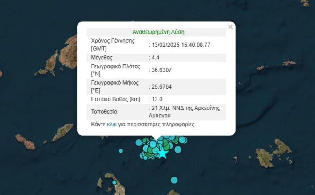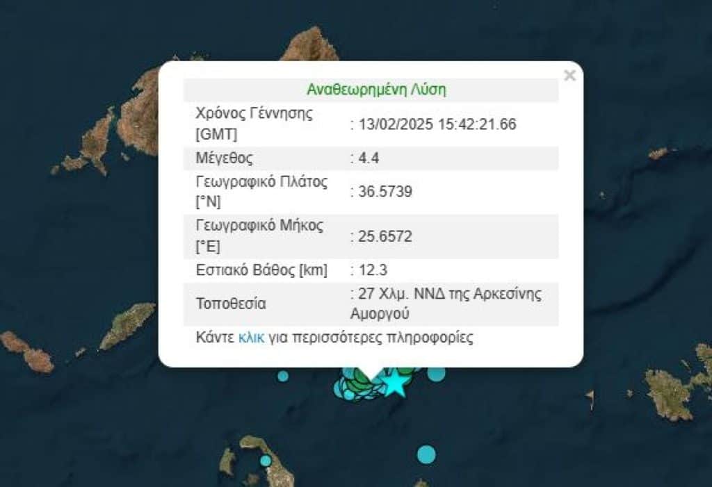 Η πρώτη σεισμική δόνηση σημειώθηκε στις 17:40 και η δεύτερη στις 17:42 νότια, νοτιοδυτικά της Αρκεσίνης Αμοργού.