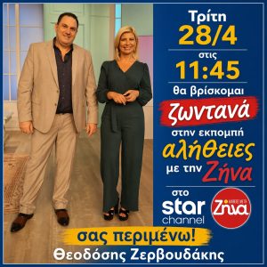 Μια ιδιαίτερα ενδιαφέρουσα τηλεοπτική εμφάνιση αναμένεται αυτή την Τρίτη στο Star Channel, καθώς ο ιδρυτής του ομίλου ZER, Θεοδόσης Ζερβουδάκης, θα είναι καλεσμένος στην εκπομπή «Αλήθειες με τη Ζήνα». Ο γνωστός επιχειρηματίας, που έχει ταυτίσει το όνομά του με την καινοτομία και την εξέλιξη στον χώρο της τεχνολογίας και των τηλεπικοινωνιών, θα μοιραστεί τη δική του πορεία και τις εμπειρίες του με τη Ζήνα Κουτσελίνη.