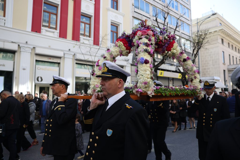 Μυροφόρες έραιναν τον Επιτάφιο με άνθη, ενώ αξιωματικοί του Ναυτικού τον μετέφεραν, συνοδευόμενοι από προσκόπους και μέλη του Ερυθρού Σταυρού. Πλήθος πιστών ακολούθησε την πομπή, με τις καμπάνες να ηχούν πένθιμα σε όλο το κέντρο.