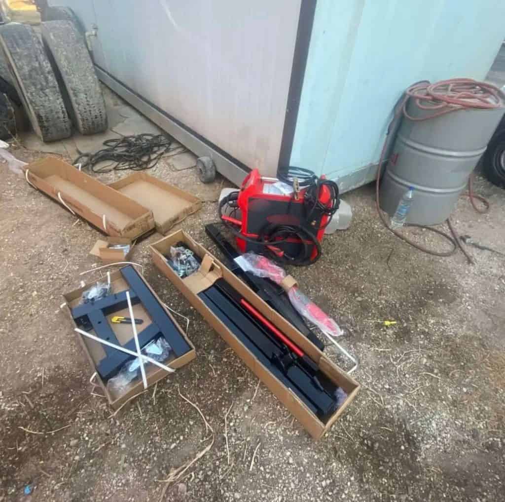 -εξοπλισμός και μηχανήματα της εταιρείας παροχής υπηρεσιών μεταφορών (γερανός, τροχός, μηχάνημα ηλεκτροκόλλησης, εργαλεία κ.α.).