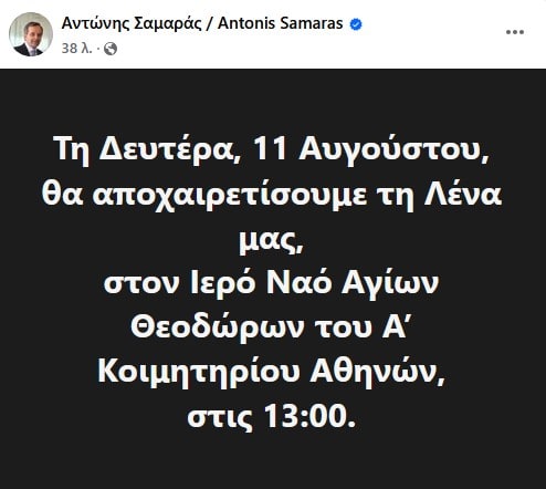 Τη Δευτέρα 11 Αυγούστου, συγγενείς και φίλοι θα πουν το τελευταίο αντίο στη Λένα Σαμαρά, στον Ιερό Ναό Αγίων Θεοδώρων, στο Α’ Κοιμητήριο Αθηνών, στις 13:00. Την είδηση της κηδείας της γνωστοποίησε ο ίδιος ο πρώην πρωθυπουργός με μια λιτή και συγκινητική ανάρτηση.