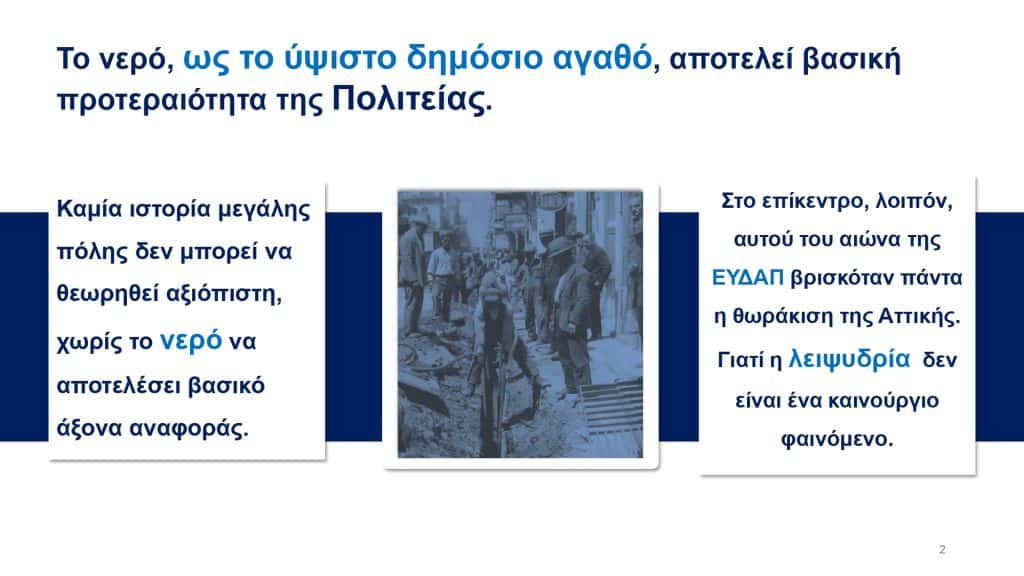 Ο πρόεδρος της ΕΥΔΑΠ, Γιώργος Στεργίου, έκανε μία ιστορική αναδρομή, υπογραμμίζοντας, μεταξύ άλλων, τον ρόλο του Ελ. Βενιζέλου, ο οποίος με τη συνεργασία της Ούλεν, δημιούργησε το πρώτο δίκτυο νερού στην πρωτεύουσα, αλλά και του Κωνσταντίνου Καραμανλή, στις μέρες του οποίου έγινε πράξη η ολοκληρωμένη διαχείριση του νερού από την ΕΥΔΑΠ. Αναφέρθηκε επίσης στη σημαντική συμβολή των πρωθυπουργών Κωνσταντίνου Μητσοτάκη που διαχειρίστηκε με απόλυτη επιτυχία την κρίση της λειψυδρίας στην αρχή της δεκαετίας του 90′, αλλά και του Κώστα Σημίτη. Τέλος, υπογράμμισε τον ρόλο νυν πρωθυπουργού Κυριάκου Μητσοτάκη, αλλά και τη συμβολή του ανθρώπινου δυναμικού της εταιρείας.