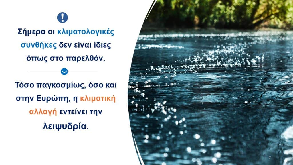 Ειδικότερα, όπως ανέφερε ο κ. Παπασταύρου, σήμερα οι κλιματική αλλαγή εντείνει τη λειψυδρία ενώ βρισκόμαστε σε ένα από τα πιο χαμηλά σημεία διαθεσιμότητας νερού. Τα μέτρα που υλοποιούνται άμεσα σε 7 άξονες στρατηγικής δράσης, και εναρμονίζονται με τις ευρωπαϊκές μας δεσμεύσεις. Πρόκειται για μέτρα που θωρακίζουν την ύδρευση για άνω του 50% του πληθυσμού της χώρας και οργανώνουν το τοπίο διαχείρισης νερού.