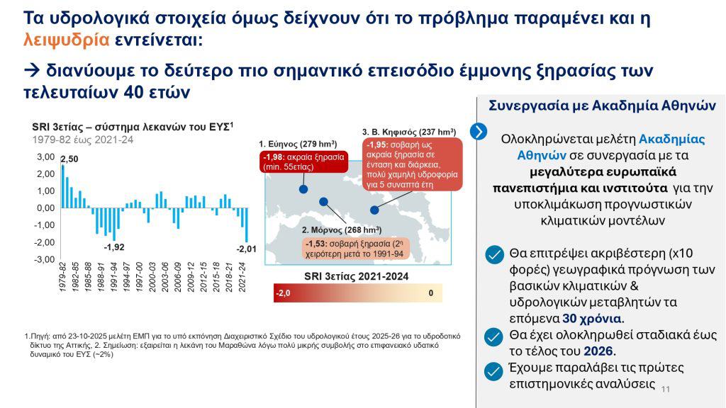 Ταυτόχρονα, η ΕΥΔΑΠ τρέχει βραχυπρόθεσμες δράσεις, με στόχο την άμεση υδροδοτική θωράκιση της Αττικής: Μεταξύ άλλων, αξιοποιεί και ενεργοποιεί γεωτρήσεις σε Μαυροσουβάλα, Ούγγρους και Βοιωτικό Κηφισό με συνολική συνεισφορά περίπου 150 εκατ. κυβικά μέτρα νερού τον χρόνο, μόλις ολοκληρωθούν.