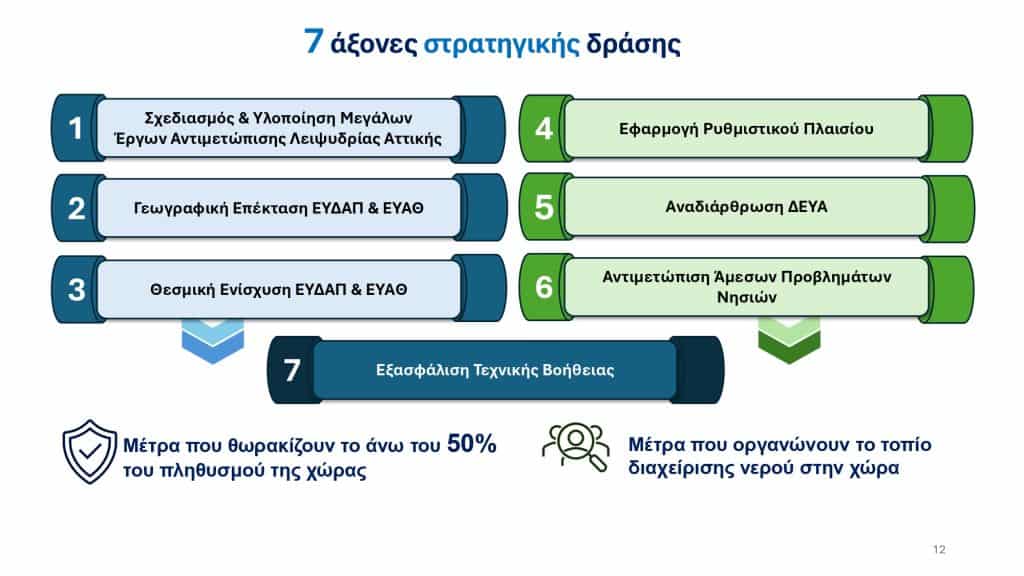 Ταυτόχρονα, επέκταση αρμοδιοτήτων ΕΥΔΑΠ/ΕΥΑΘ και στην άρδευση: Πρόκειται για μια σημαντική μεταρρύθμιση με στόχο την συνολική διαχείριση του νερού. Για πρώτη φορά οι ΕΥΔΑΠ & ΕΥΑΘ θα έχουν συνολική ευθύνη και για την ύδρευση και για την άρδευση στην γεωγραφική περιοχή της αρμοδιότητάς τους. Αποτελεί ένα πρώτο βήμα στο νοικοκύρεμα 750 παρόχων σε ένα κατακερματισμένο τοπίο.