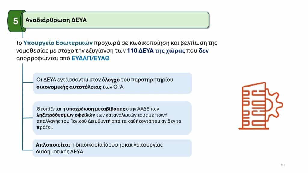 Ταυτόχρονα, από την πλευρά του, το Υπουργείο Εσωτερικών προχωρά σε κωδικοποίηση και βελτίωση της νομοθεσίας, με στόχο την εξυγίανση των 110 Δημοσίων Επιχειρήσεων Ύδρευσης και Αποχέτευσης (ΔΕΥΑ) της χώρας που δεν απορροφώνται από ΕΥΔΑΠ/ΕΥΑΘ.