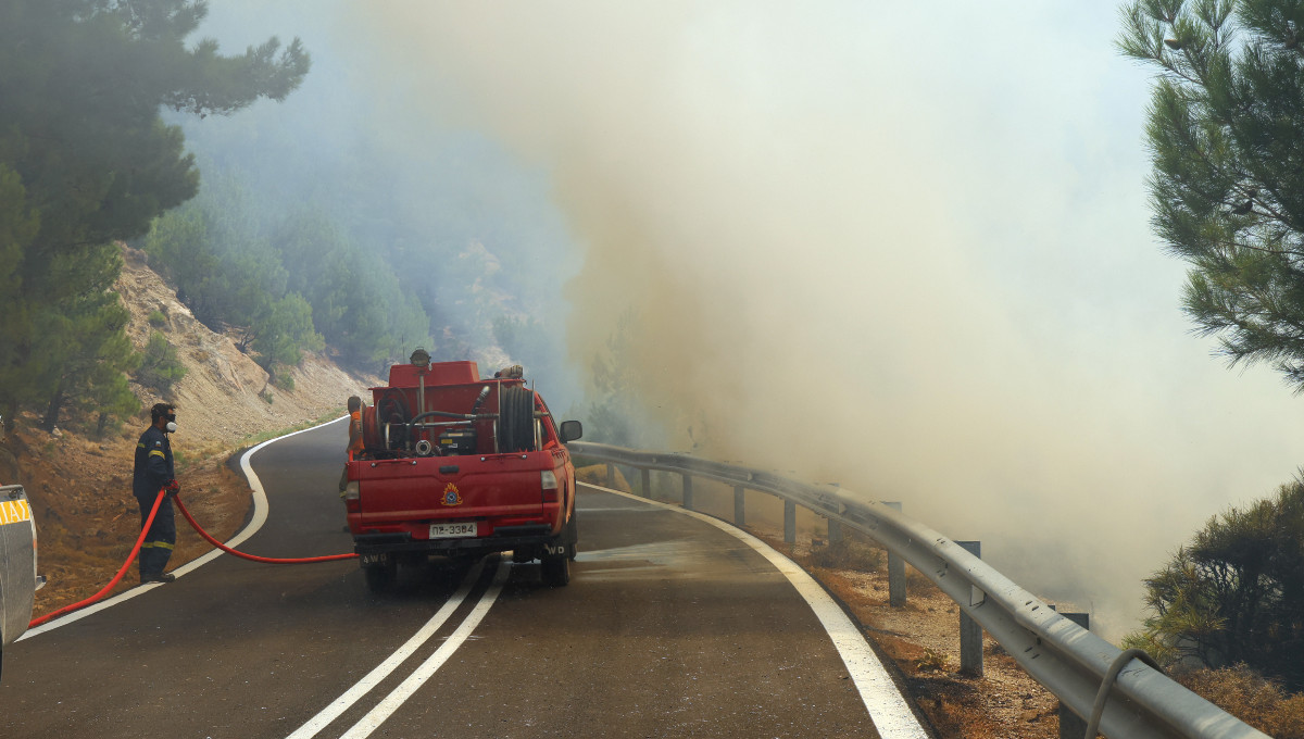 Οι πυροσβεστικές δυνάμεις παραμένουν σε επιφυλακή, καθώς οι άνεμοι που πνέουν στην περιοχή προκαλούν αναζωπυρώσεις.