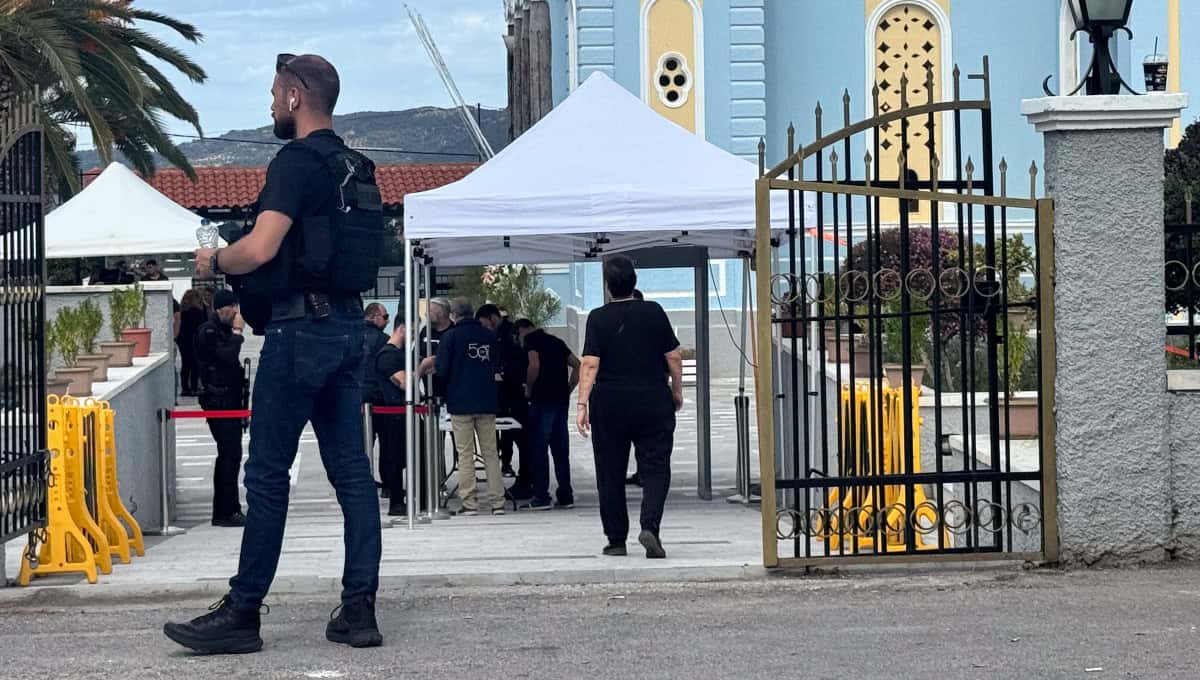 Στην είσοδο του Ιερού Ναού Τιμίου Σταυρού στον Αλικιανό, όπου τελείται η εξόδιος ακολουθία, έχει τοποθετηθεί ανιχνευτής μετάλλων, ενώ σκύλος ανίχνευσης εκρηκτικών πραγματοποίησε έλεγχο τόσο εντός όσο και περιμετρικά του ναού. Δεκάδες αστυνομικοί έχουν αναπτυχθεί από νωρίς στους γύρω δρόμους και στο κοιμητήριο, σε μια προσπάθεια να διασφαλιστεί η ομαλή διεξαγωγή της τελετής.