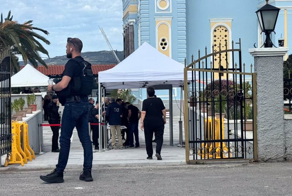 Ο προαύλιος χώρος της εκκλησίας του Τιμίου Σταυρού στον Αλικιανό όπου τελέστηκε η εξόδιος ακολουθία είχε ισχυρή αστυνομική παρουσία με ενόπλους αστυνομικούς των ειδικών μονάδων της ΕΛΑΣ ενώ νωρίτερα σκύλος της αρμόδιας υπηρεσίας έλεγξε τους χώρους πέριξ του ναού για τυχόν επικίνδυνα ευρήματα.