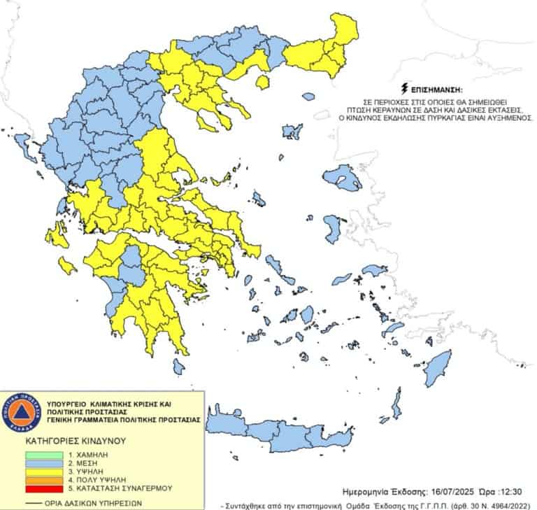 Υψηλός κίνδυνος πυρκαγιάς (κατηγορία κινδύνου 3) προβλέπεται για σήμερα Πέμπτη 17 Ιουλίου στη Θεσσαλονίκη, σύμφωνα με τον Χάρτη Πρόβλεψης Κινδύνου Πυρκαγιάς της Γενικής Γραμματείας Πολιτικής Προστασίας του υπουργείου Κλιματικής Κρίσης και Πολιτικής Προστασίας (civilprotection.gov.gr).