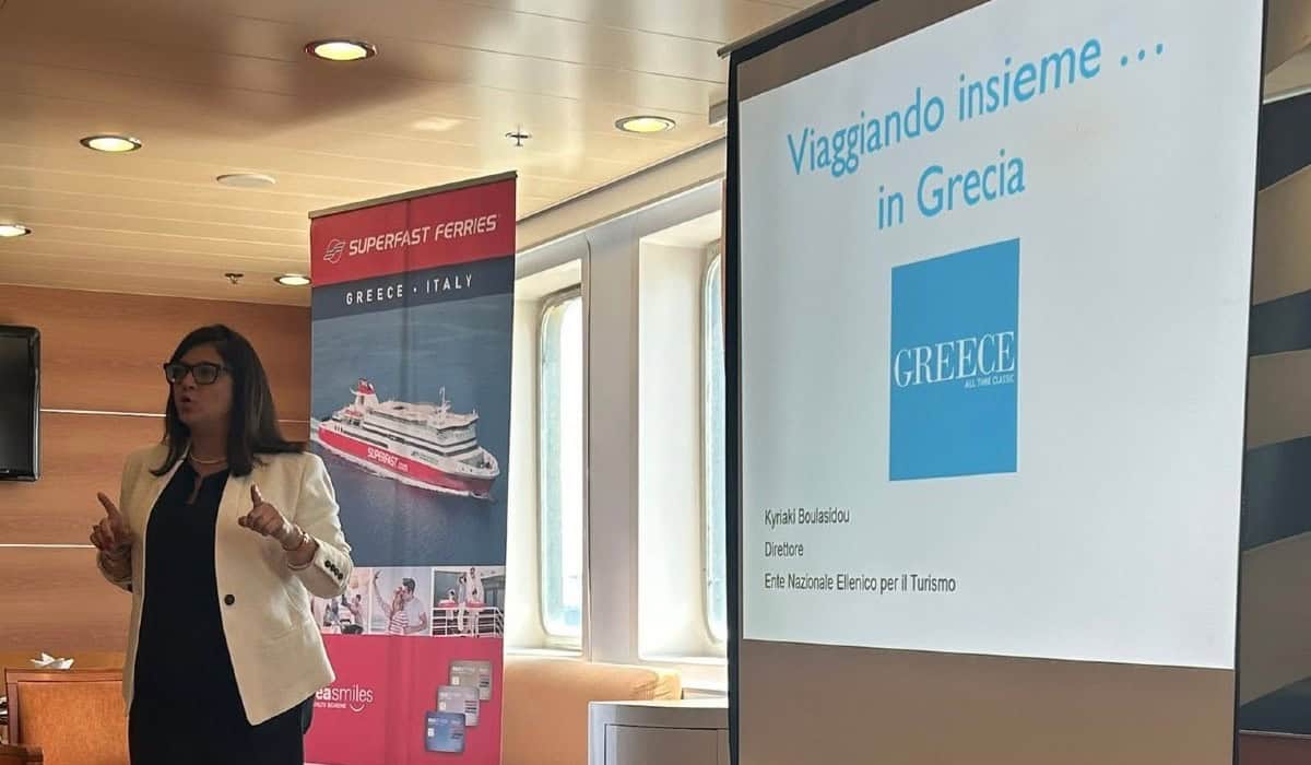 Κατά τη διάρκεια της εκδήλωσης, που πραγματοποιήθηκε σε πλοίο της εταιρείας το οποίο εκτελεί το δρομολόγιο Μπάρι-Ηγουμενίτσα, η προϊσταμένη της συγκεκριμένης υπηρεσίας του ΕΟΤ, Κυριακή Μπουλασίδου, παρουσίασε λιγότερο γνωστούς στην ιταλική αγορά ελληνικούς προορισμούς και τις αυθεντικές εμπειρίες που μπορεί να ζήσει σε αυτούς κάθε επισκέπτης, ενώ ιδιαίτερη μνεία έκανε στη σημασία της βιωσιμότητας στον τουρισμό, τάση που κερδίζει συνεχώς έδαφος και στην Ιταλία.