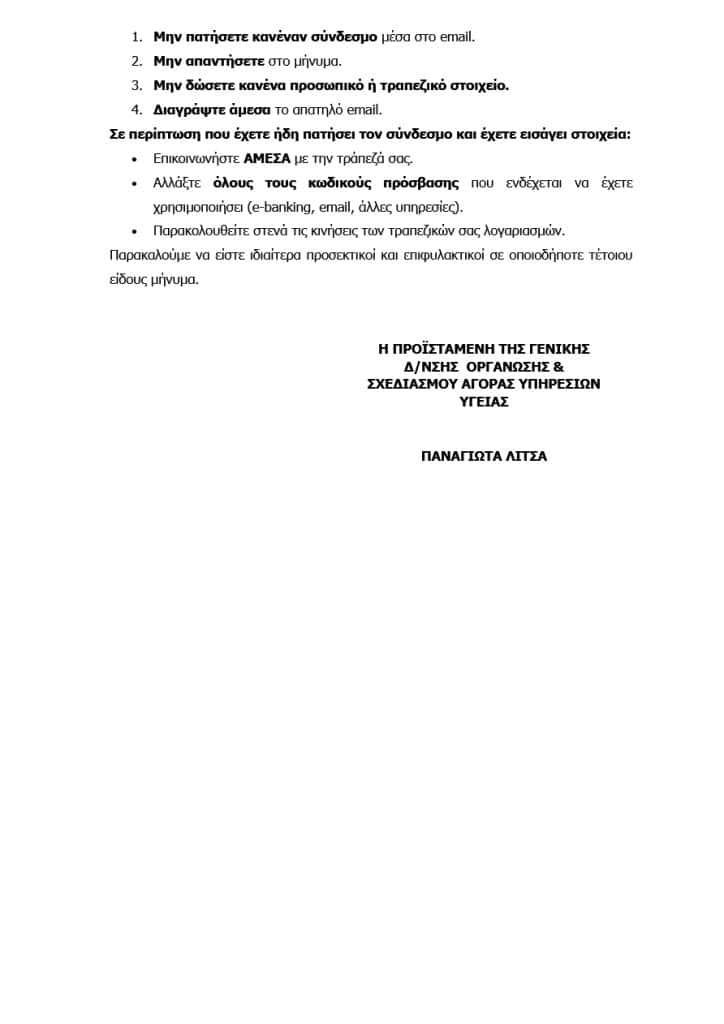 «Ενημερώθηκα πριν λίγο, ότι σε μερικούς συμπολίτες μας έχει σταλεί αυτό το μήνυμα. Προσοχή πρόκειται περί απάτης! Μην στείλετε σε κανέναν τα στοιχεία του λογαριασμού σας και να ενημερώσετε αμέσως τις αρχές».