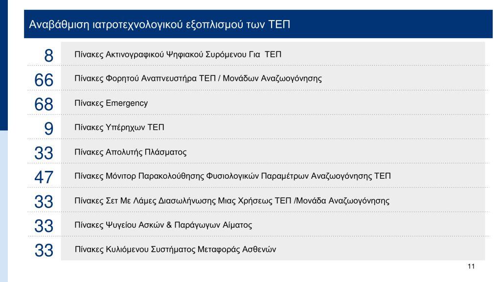 «Έχει γίνει μια πολύ συστηματική δουλειά έτσι ώστε όλα τα ΤΕΠ να έχουν οργανωθεί με βάση τις βέλτιστες διεθνείς προδιαγραφές οργάνωσης και λειτουργίας. Σε όλα τα ΤΕΠ υπάρχει ξεχωριστή είσοδος για τα ασθενοφόρα και ξεχωριστή είσοδος για τους περιπατητικούς ασθενείς. Υπάρχει οργανωμένη νοσηλευτική υπηρεσία στο κέντρο των ΤΕΠ έτσι ώστε η διασταύρωση κινήσεων να είναι όσο το δυνατόν μικρότερη για τους επαγγελματίες υγείας αλλά και να μπορούν βεβαίως να προσφεύγουν σε όλους τους ασθενείς που έχουν ανάγκη σε ταχύτατο ρυθμό. Επίσης, προβλέπεται συγκεκριμένος χώρος αναμονής των ασθενών και των συνοδών των ασθενών έτσι ώστε να διευκολύνονται. Με όλα αυτά που κάνουμε, βελτιώνουμε την εικόνα των εφημεριών στα ΤΕΠ όχι σε επίπεδο εντυπώσεων αλλά σε επίπεδο ουσίας, προκειμένου οι ασθενείς να απολαμβάνουν τις καλύτερες δυνατές υπηρεσίες που δικαιούνται».