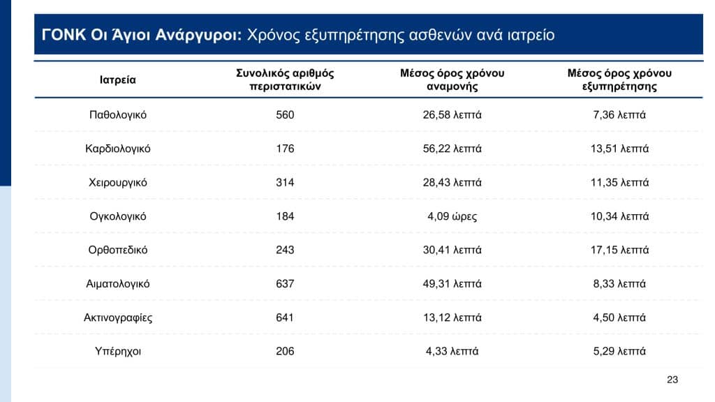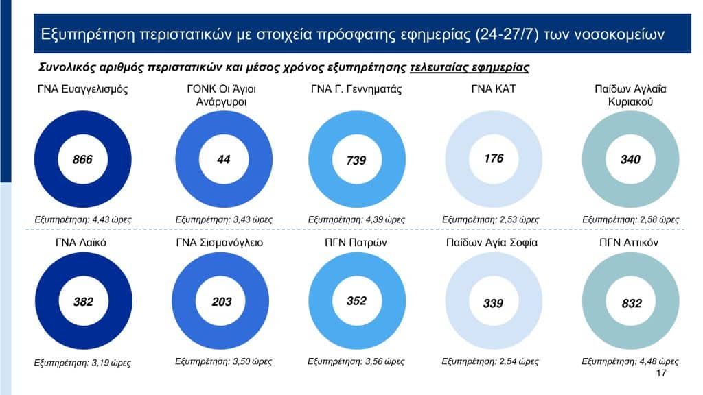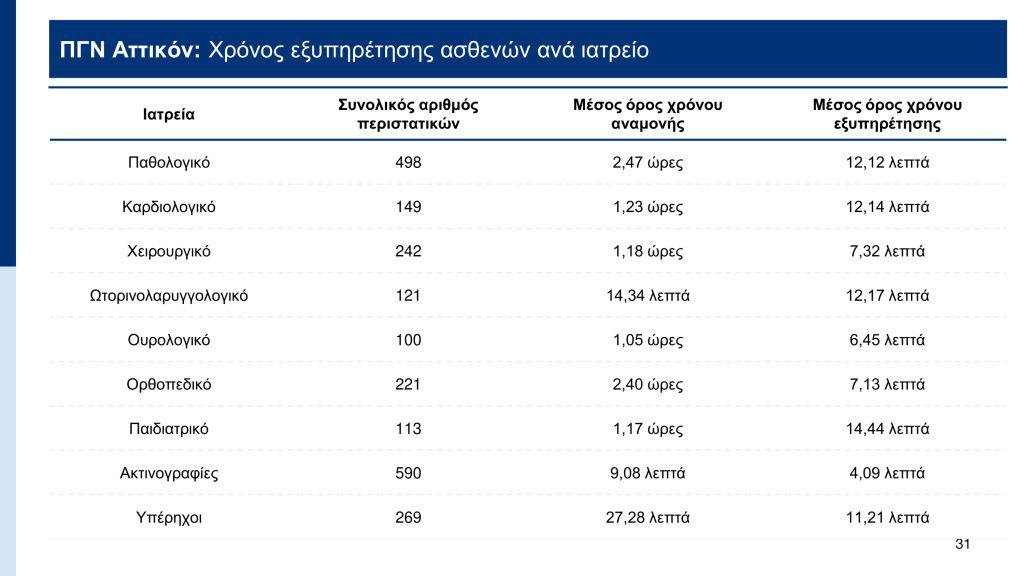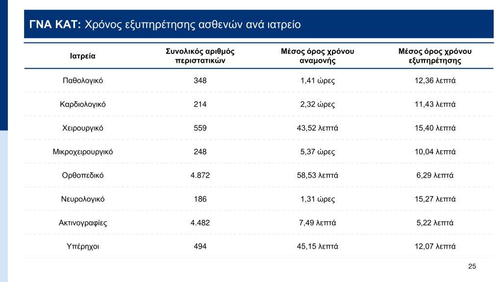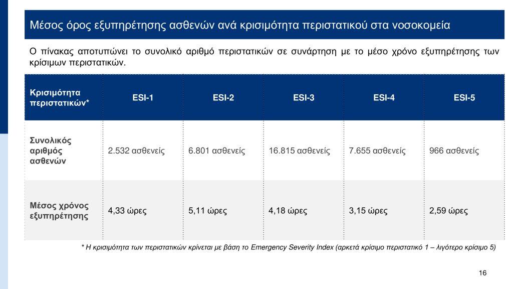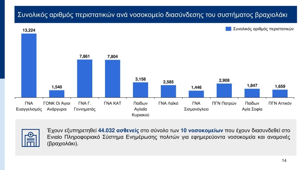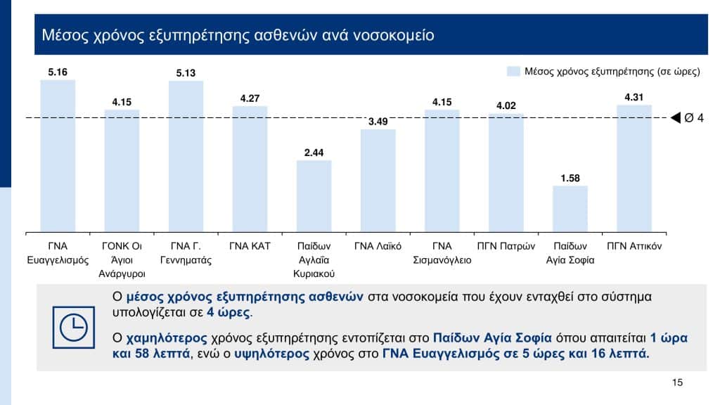 Σύμφωνα με τα στοιχεία που παρουσιάστηκαν, με το σύστημα ηλεκτρονικής ιχνηλάτησης (βραχιολάκι) που εφαρμόζεται ήδη σε 10 νοσοκομεία – ΓΝΑ «Ευαγγελισμός», ΓΟΝΚ «Οι Άγιοι Ανάργυροι», ΓΝΑ «Γ. Γεννηματάς», ΓΝΑ «ΚΑΤ», Παίδων «Αγλαϊα Κυριακού», ΓΝΑ «Λαϊκό», ΓΝΑ «Σισμανόγλειο», Πανεπιστημιακό Γενικό Νοσοκομείο Πατρών, Παίδων «Αγία Σοφία», ΠΓΝ «Αττικόν» – ο μέσος χρόνος εξυπηρέτησης υπολογίζεται στις 4 ώρες. Ο χαμηλότερος χρόνος εντοπίζεται στο Παίδων «Αγία Σοφία» όπου απαιτείται 1 ώρα και 58 λεπτά, ενώ ο υψηλότερος χρόνος στο ΓΝΑ «Ευαγγελισμός» όπου απαιτούνται 5 ώρες και 16 λεπτά.