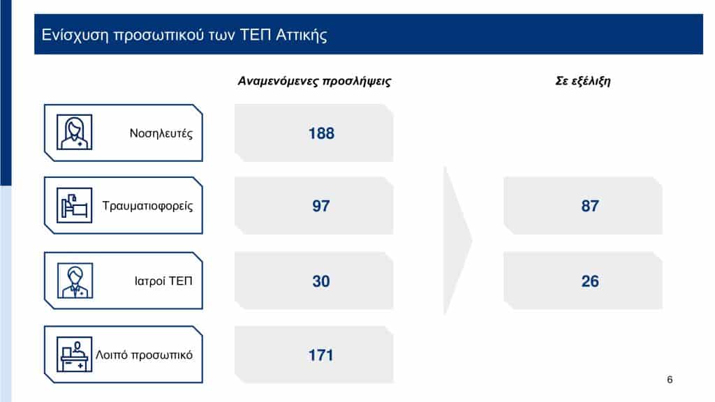 «Η ηλεκτρονική ιχνηλάτηση στα Τμήματα Επειγόντων Περιστατικών αποτελεί μια ακόμη σημαντική μεταρρύθμιση, μια αλλαγή στην πράξη. Με ήδη χειροπιαστό αποτέλεσμα, με ήδη μετρήσιμη την βελτίωση στην καθημερινότητα των πολιτών. Για πρώτη φορά έχουμε πραγματική εικόνα για τη λειτουργία των ΤΕΠ, τη ροή των ασθενών, τις καθυστερήσεις, τις ανάγκες του κάθε νοσοκομείου. Τα πρώτα στοιχεία δείχνουν σαφή πρόοδο με μικρότερη αναμονή, καλύτερη οργάνωση, πιο ανθρώπινες συνθήκες για τον ασθενή. Η αλλαγή, όμως, δεν περιορίζεται μόνο σε αυτό. Η στρατηγική μας περιλαμβάνει πέντε βασικούς άξονες: τις οργανωτικές αλλαγές στο σύστημα εφημέρευσης στην Αττική, την ενίσχυση του προσωπικού των ΤΕΠ, τις ανακαινίσεις των χώρων, την αναβάθμιση του ιατροτεχνολογικού εξοπλισμού, την εφαρμογή Ενιαίου Πληροφοριακού Συστήματος ενημέρωσης πολιτών για τα εφημερεύοντα νοσοκομεία και τους χρόνους αναμονής. Συνεχίζουμε με σχέδιο, βούληση και τόλμη να αξιοποιούμε όλες τις δυνατότητες του Εθνικού Συστήματος Υγείας, επ’ ωφελεία των ασθενών. Μεταρρυθμίζουμε το ΕΣΥ στην πράξη, για να ανταποκρίνεται στις πραγματικές ανάγκες των πολιτών. Γιατί το ΕΣΥ, είμαστε «εμείς»».
