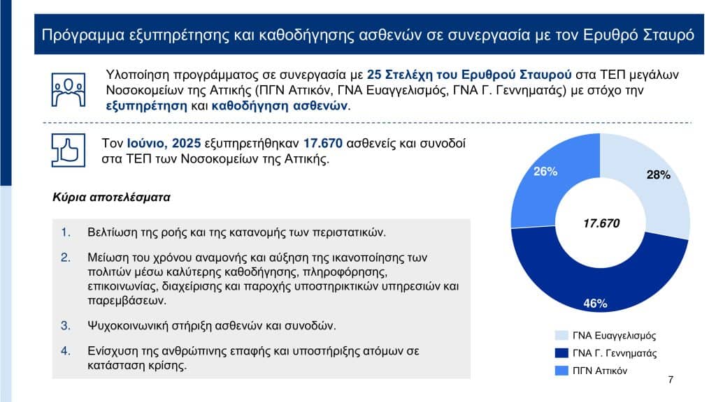«Ο Ελληνικός Ερυθρός Σταυρός πράγματι ανταποκρίθηκε άμεσα στο κάλεσμα του Υπουργού να βοηθήσουμε στη βελτίωση της λειτουργίας των ΤΕΠ των μεγάλων κρατικών νοσοκομείων, έχοντας μία πραγματικά μεγάλη εμπειρία και τεχνογνωσία. Αναλάβαμε πράγματι αυτό το καθήκον, με τρεις στόχους και σκοπούς: Την εξυπηρέτηση-υποστήριξη των ροών των ασθενών στα ΤΕΠ, ώστε να μειωθούν οι καθυστερήσεις. Τη βελτίωση της επικοινωνίας του προσωπικού με τους ασθενείς που προσέρχονται στα ΤΕΠ και επίσης την καθοδήγηση των ασθενών μέσα στα ΤΕΠ και τη βοήθεια ώστε να βρίσκουν πολύ πιο εύκολα τα ιατρεία εκεί όπου χρειάζονται να πάνε. Η παρουσία των εθελοντών του Ελληνικού Ερυθρού Σταυρού μας υπενθυμίζει ότι η ανθρωπιά δεν έχει χαθεί, βρίσκεται ακόμα εδώ και είναι μπροστά μας και σχολιάστηκε ως ιδιαίτερα βοηθητική, με αρκετούς να αναφέρουν πως πρώτη φορά βιώνουν τέτοια εξυπηρέτηση στον χώρο υγείας».
