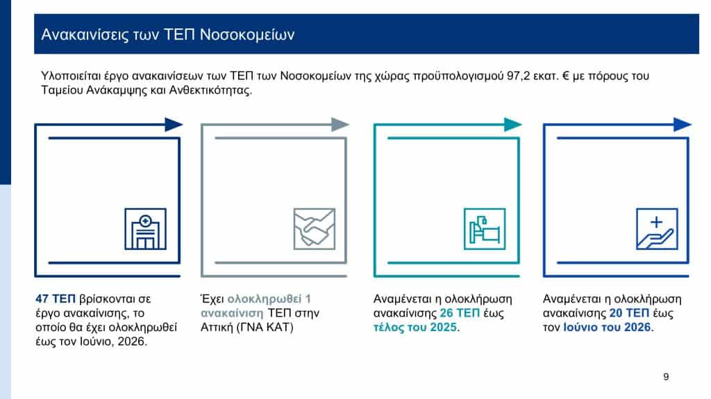 «Πριν από μερικούς μήνες και συγκεκριμένα τον Φεβρουάριο του 2025, με τον Υφυπουργό κύριο Μάριο Θεμιστοκλέους και τη Γενική Γραμματέα κυρία Λίλιαν Βιλδιρίδη σας είχαμε παρουσιάσει το σχέδιό μας για τη μείωση του μέσου χρόνου αναμονής στις εφημερίες. Δηλαδή τον μέσο χρόνο μεταξύ της ώρας που κάποιος φτάνει στα επείγοντα ενός νοσοκομείου και της ώρας που είτε φεύγει για το σπίτι του, είτε κάνει εισαγωγή για να μπει σε μια κλινική του νοσοκομείου.
