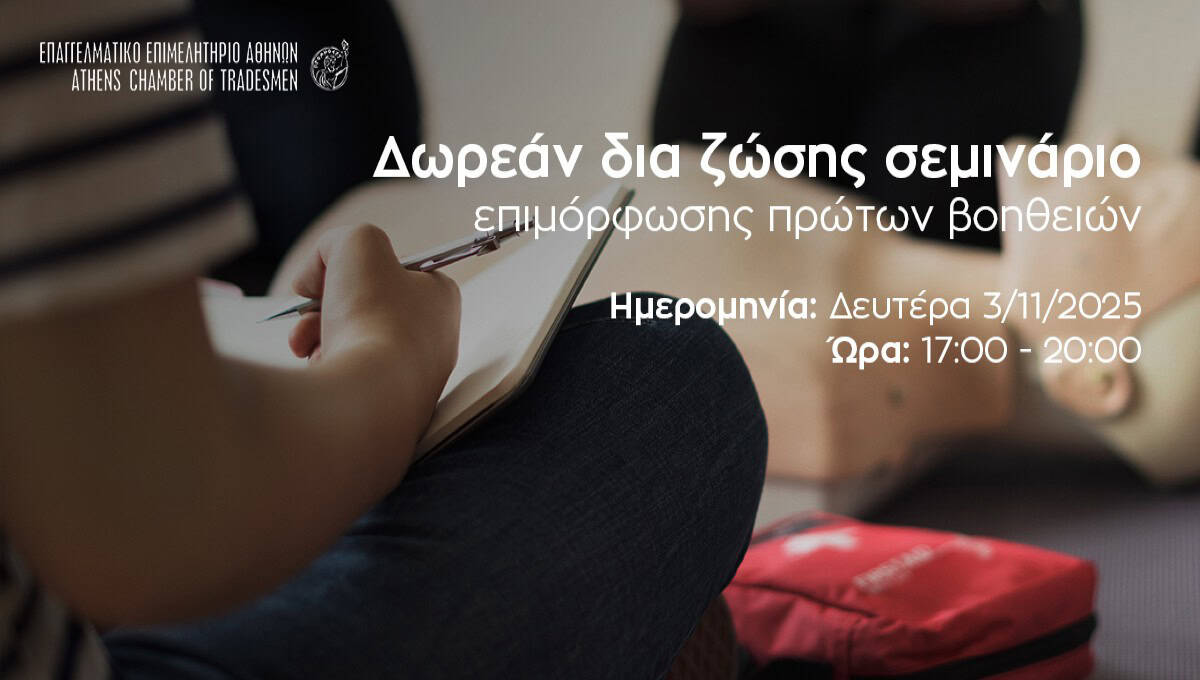 Δωρεάν δια ζώσης σεμινάριο επιμόρφωσης πρώτων βοηθειών (BLS-AED), διοργανώνει τη Δευτέρα 3 Νοεμβρίου, η Επιτροπή Ιδιωτικών Βρεφονηπιακών και Παιδικών Σταθμών του Επαγγελματικού Επιμελητηρίου Αθηνών, σε συνεργασία με τον πιστοποιημένο εκπαιδευτικό οργανισμό Give Life.