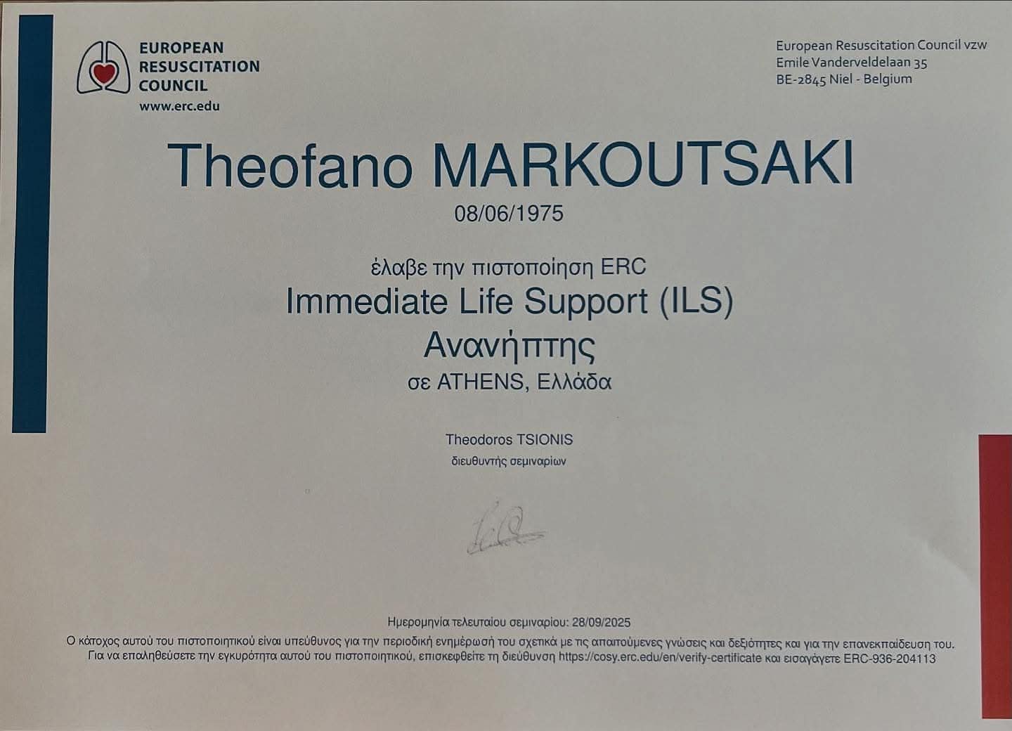 Η γαστρεντερολόγος Δρ. Μαρκουτσάκη Νίνα συμμετείχε στο σεμινάριο ILS, που διοργάνωσε η Ελληνική Γαστρεντερολογική Εταιρεία στις 28/9/2025 και έλαβε την πιστοποίηση ERC ως Ανανήπτης από το Ευρωπαϊκό Συμβούλιο Αναζωογόνησης.
