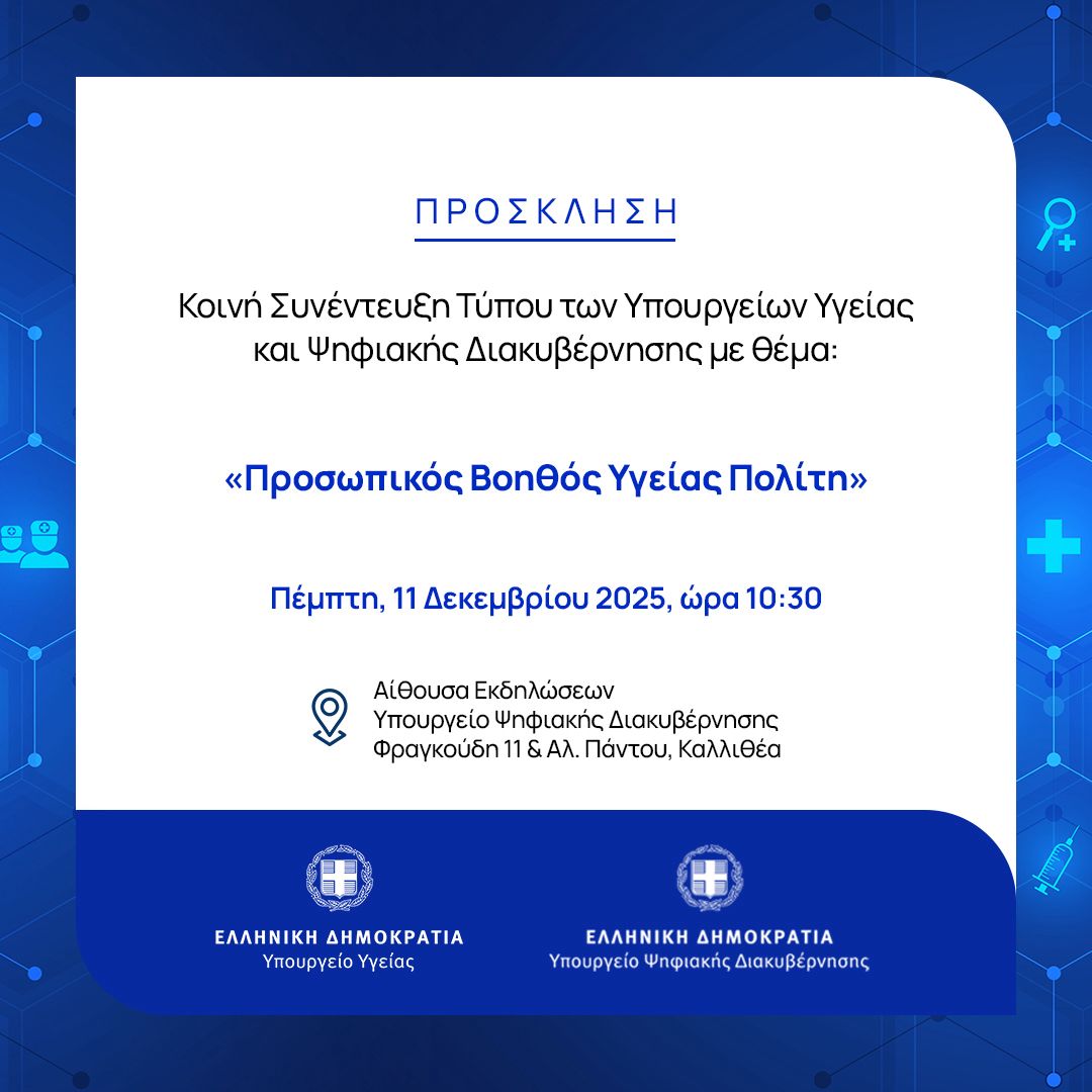 Την Πέμπτη 11 Δεκεμβρίου, στις 10:30 π.μ., θα πραγματοποιηθεί Κοινή Συνέντευξη Τύπου του υπουργείου Υγείας με το υπουργείο Ψηφιακής Διακυβέρνησης, με θέμα «Προσωπικός Βοηθός Υγείας Πολίτη».