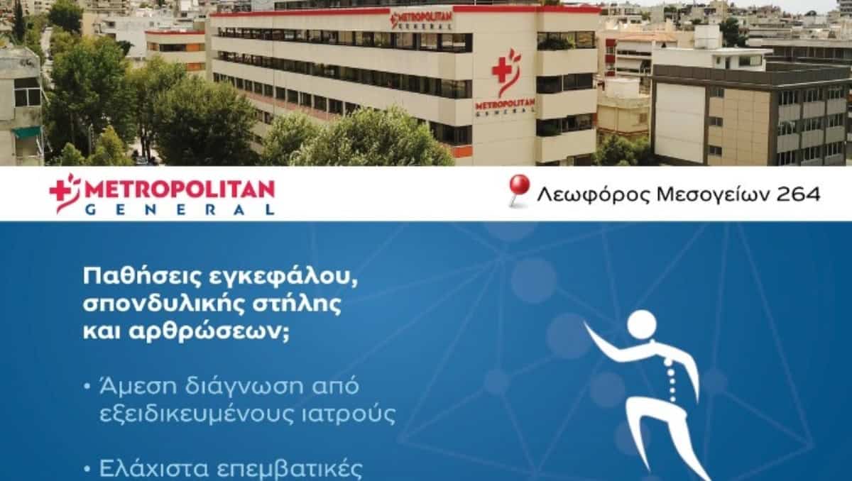 Η Κλινική Χειρουργικής Σπονδυλικής Στήλης και Μεγάλων Αρθρώσεων του θεραπευτηρίου Metropolitan General αποτελεί την ιδανική λύση στην ανάγκη εξατομικευμένης και ολιστικής αντιμετώπισης των ασθενών στο σύνολο των παθήσεων που αφορούν στον εγκέφαλο, τη σπονδυλική στήλη και τις ορθοπαιδικές παθήσεις.