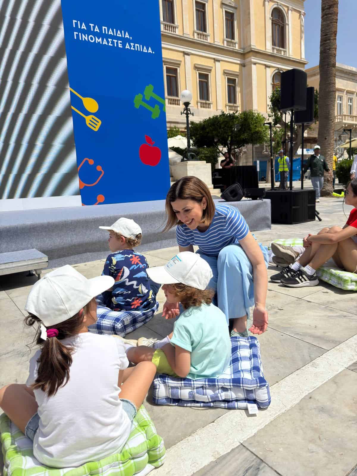 Η Αναπληρώτρια Υπουργός Υγείας Ειρήνη Αγαπηδάκη, επισκέφθηκε τη Σύρο το Σάββατο 10 Μαΐου, στο πλαίσιο της Εθνικής Δράσης κατά της Παιδικής Παχυσαρκίας. Σε συνεργασία με την UNICEF, το Υπουργείο Υγείας διοργάνωσε μια μεγάλη εκδήλωση ενημέρωσης και ευαισθητοποίησης για παιδιά και οικογένειες, μετατρέποντας την κατάμεστη Πλατεία Μιαούλη σε ένα ζωντανό κέντρο άσκησης, διατροφής και δημιουργικής δράσης.