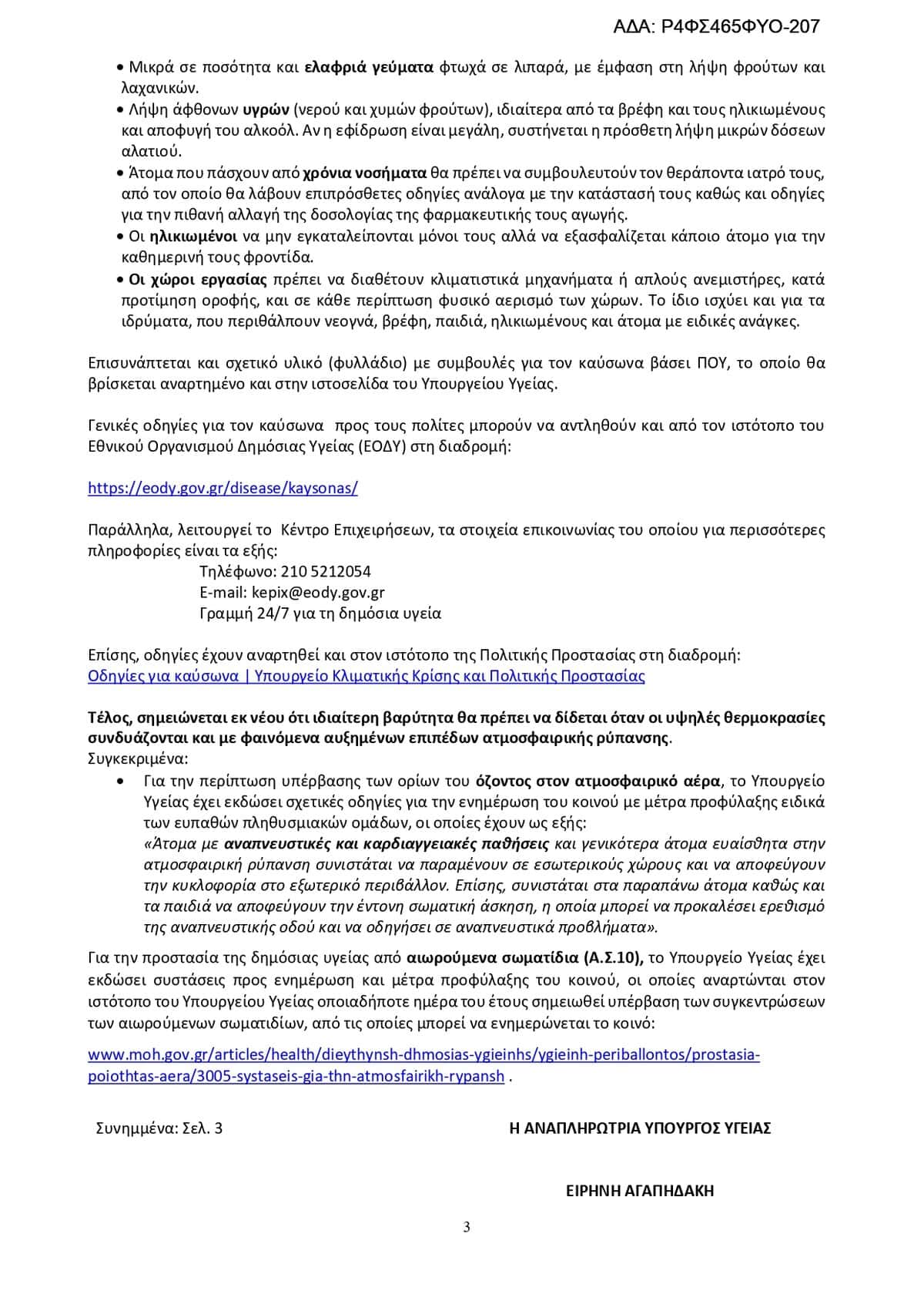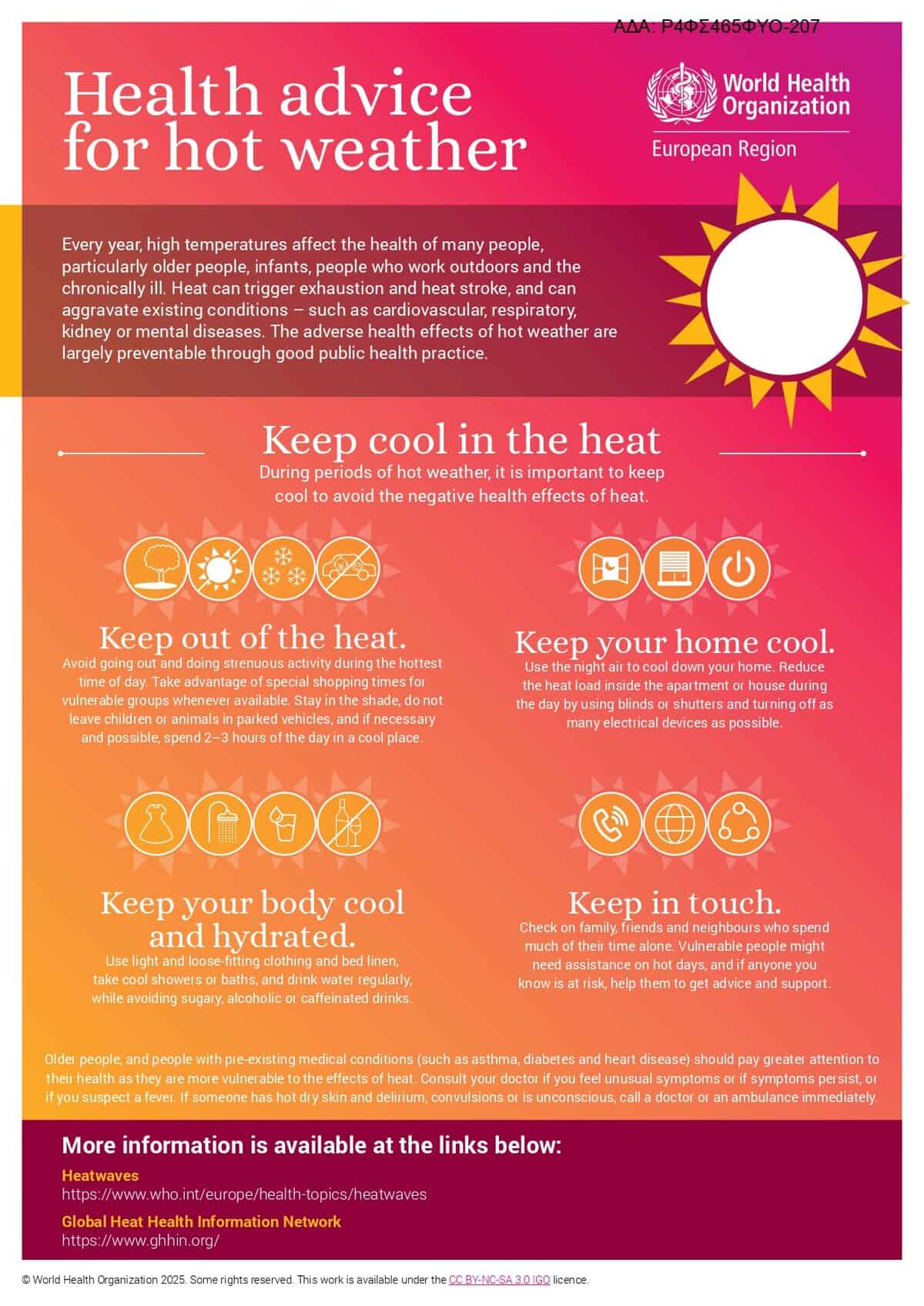 Οι υγειονομικές μονάδες της χώρας βρίσκονται σε αυξημένη ετοιμότητα, ενώ οι Δήμοι καλούνται να διασφαλίσουν δροσερούς και κλιματιζόμενους χώρους για το κοινό.