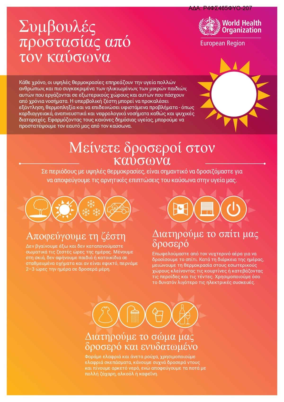 Το Υπουργείο Υγείας λόγω των παρατεταμένων υψηλών θερμοκρασιών που θα επικρατήσουν τις επόμενες ημέρες και έχοντας πάντα ως πρώτο μέλημα την προστασία της Δημόσιας Υγείας, υπενθυμίζει τις οδηγίες προστασίας των έναντι των συνεπειών του καύσωνα και καλεί όλους τους πολίτες -ιδίως όσους ανήκουν σε ευάλωτες ομάδες- να τις ακολουθήσουν.